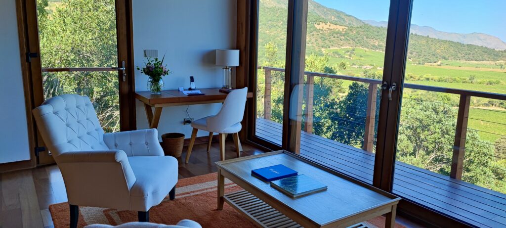 Son las llamadas residencias, y están pensadas para sentirse realmente privadas. Lo mejor es la vista: un balcón natural hacia la herradura dorada de Apalta, la que parece encenderse al final de la tarde.